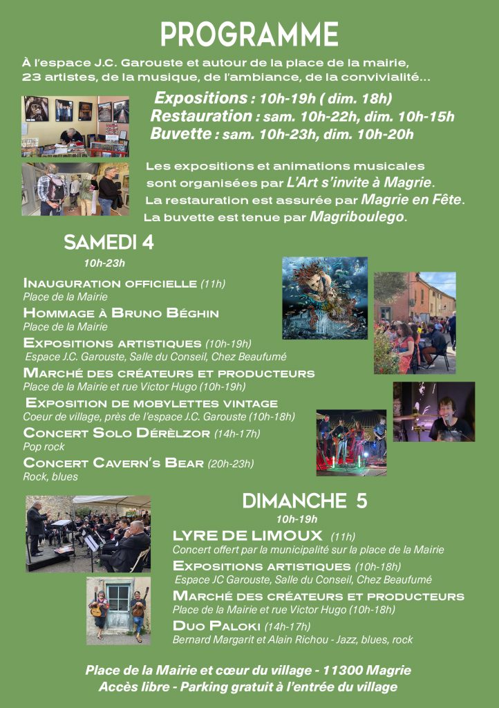 Organisé depuis 23 ans, L’Art s’invite à Magrie est devenu un rendez-vous incontournable : plus de vingt artistes sélectionnés et une ambiance festive et chaleureuse avec musique, buvette et restauration. L’entrée est libre et gratuite, et le village entier devient un espace de rencontres artistiques et humaines.